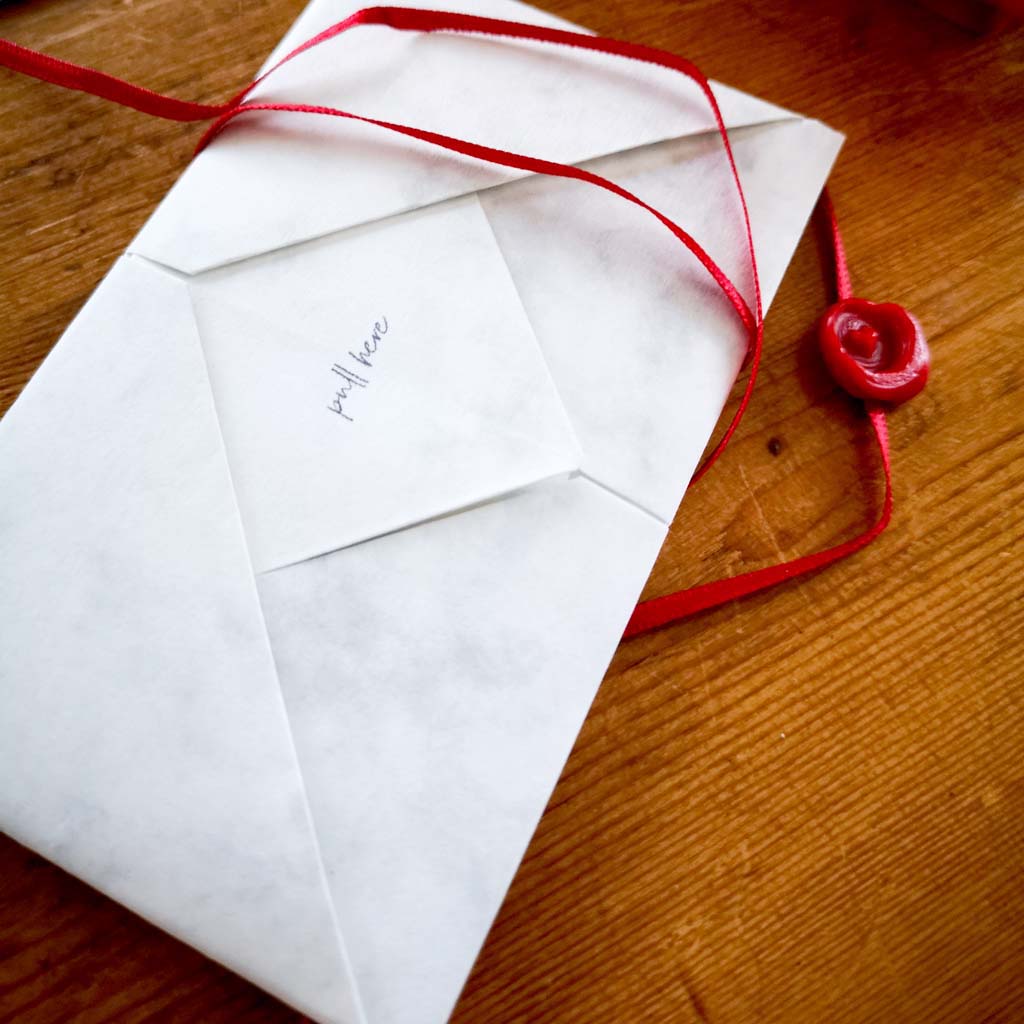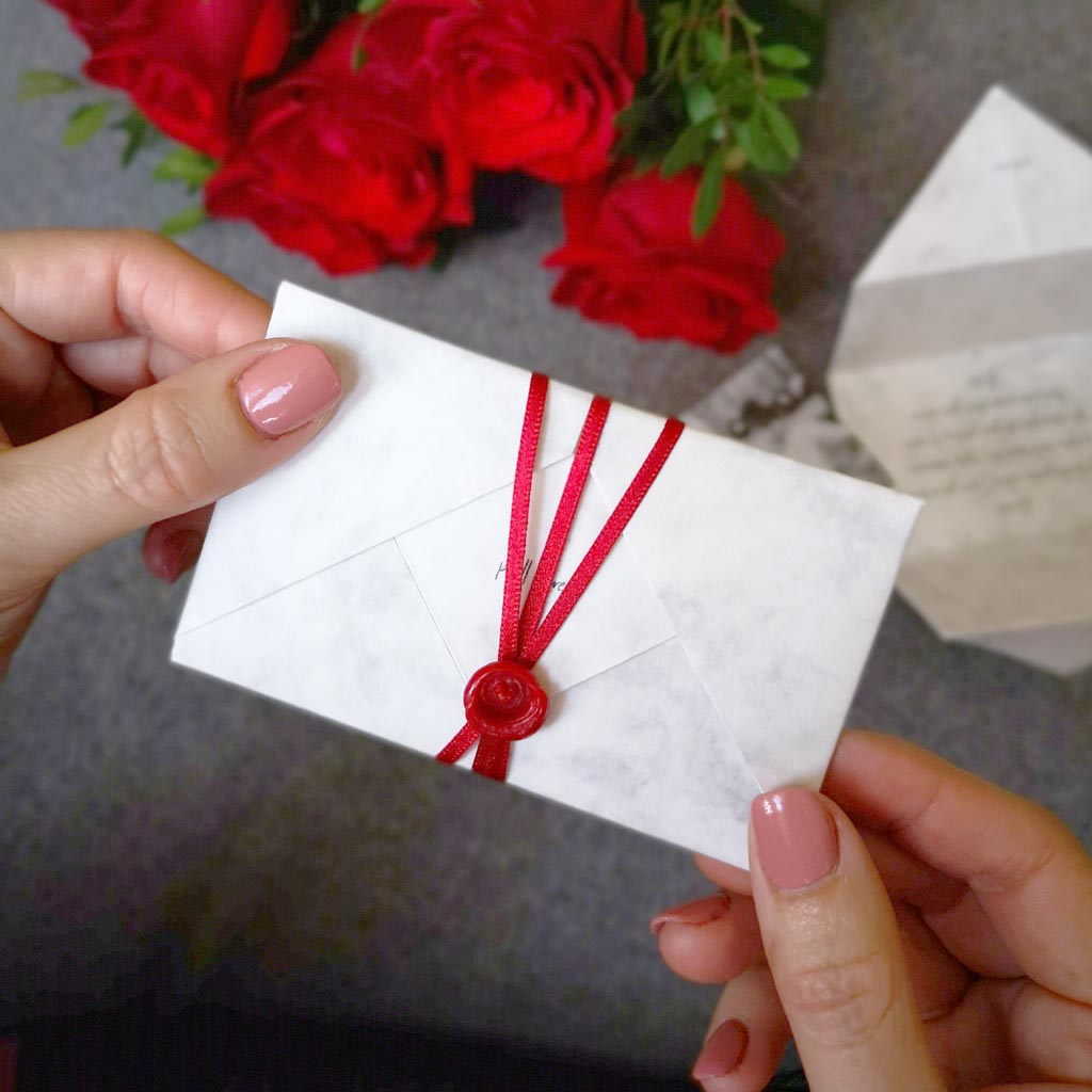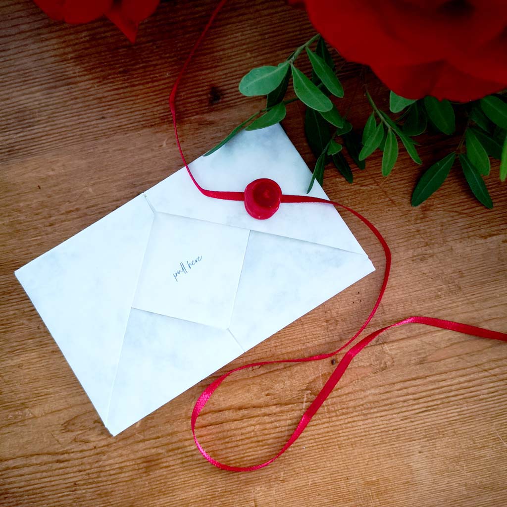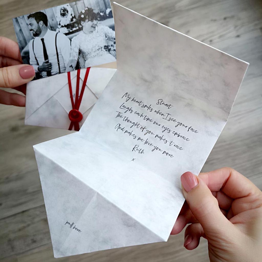 The perfect alternative card for Valentine's Day. Surprise and delight your partner with this romantic origami love letter wrapped in red ribbon and sealed with a wax seal. A gorgeous keepsake for lovers - include a photograph of a special day, your first holiday together, or the first bloom of young love. How ever many years you have spent together, this personalised origami Valentine love letter will evoke happy memories and be cherished for years to come.