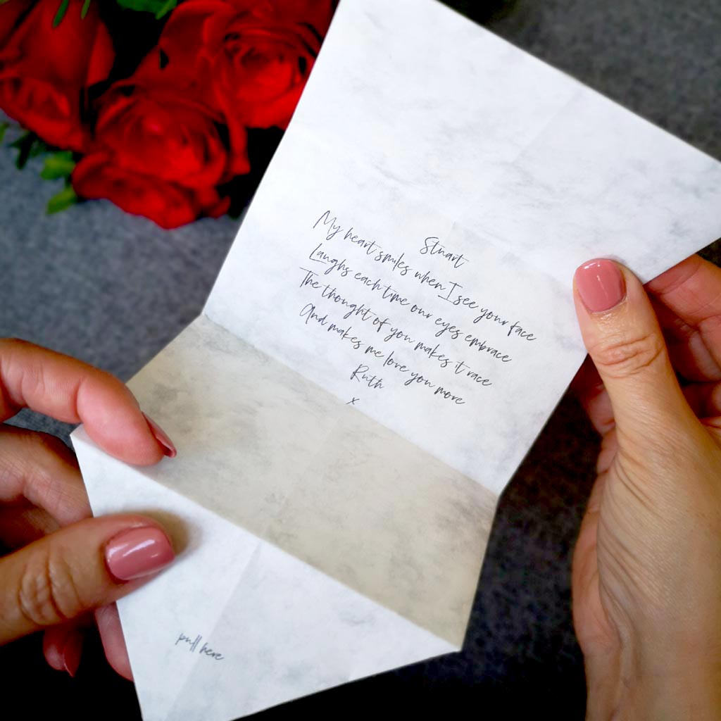 The love letter reads as follows: Stuart (enter your partner's name) My heart smiles when I see your face. Laughs each time our eyes embrace. The thought of you makes it race. And makes me love you more. Ruth x (enter your name). There is an option to add your own love letter if you wish (max 150 characters).