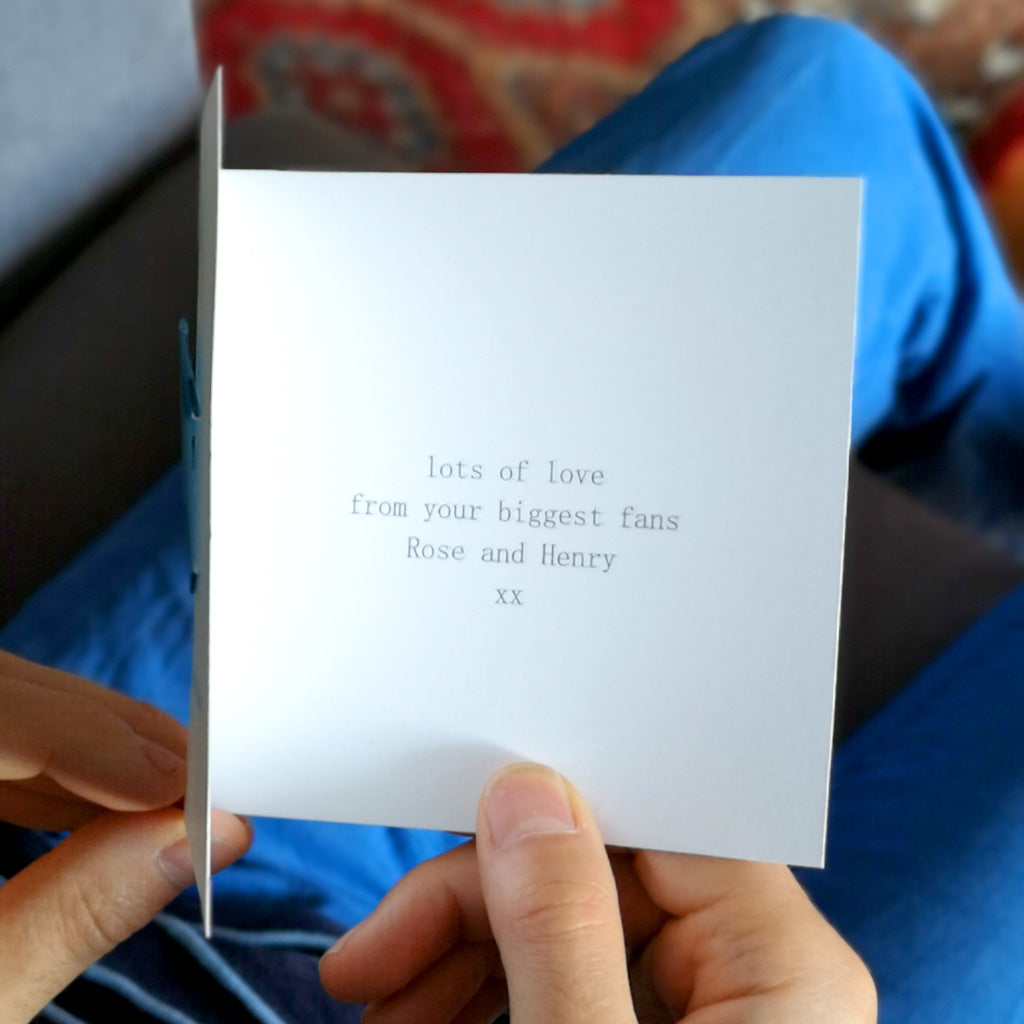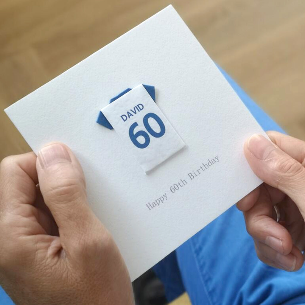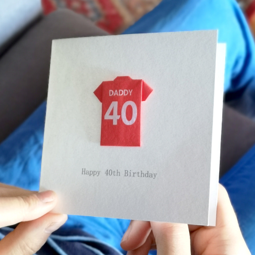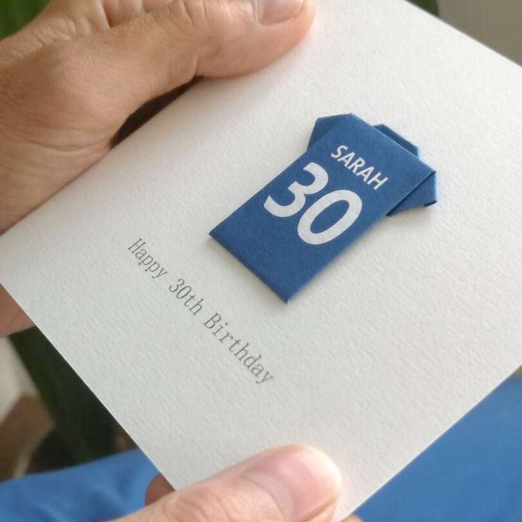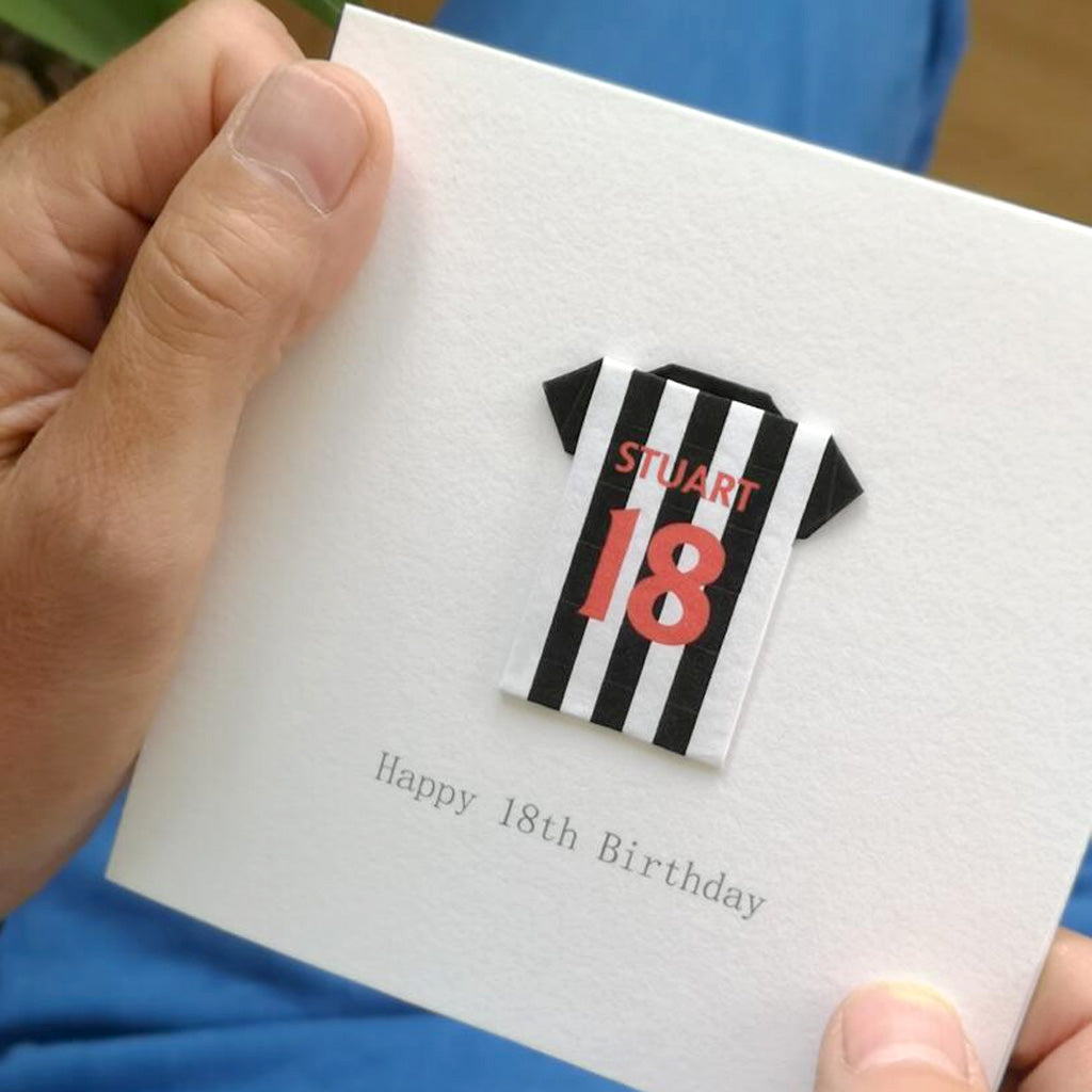 This card has a beautifully hand-folded origami football shirt on a 250 gsm square white card encased in a white envelope. It has been left blank inside for your own message. However, if you would like it posted directly to the birthday football fan, you can supply a message for the inside of the card which will be printed for you.