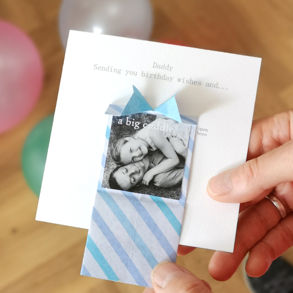 The perfect birthday card for fathers - he will be delighted to receive a card personalised with his name on the front eg. Daddy, Dad, Papa. On opening the origami gift, he will discover a favourite photograph with a secret message.