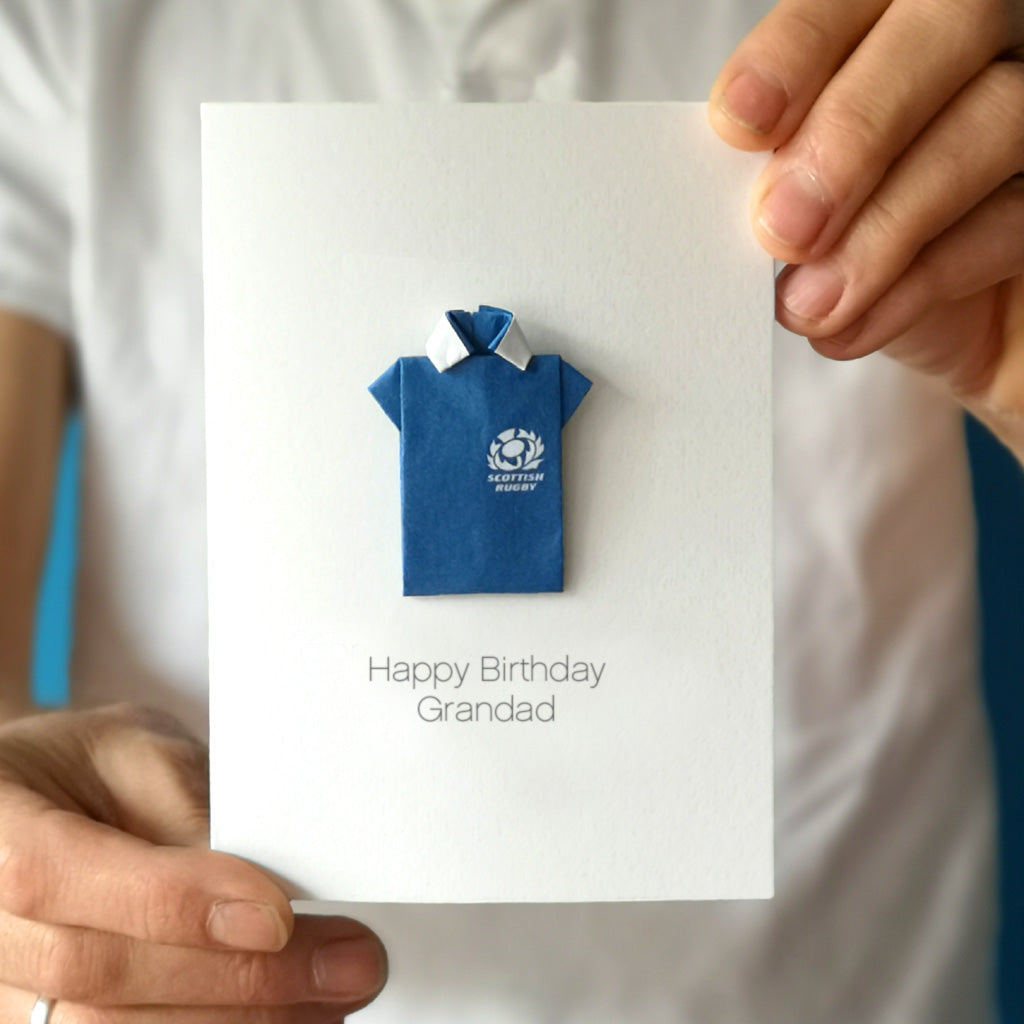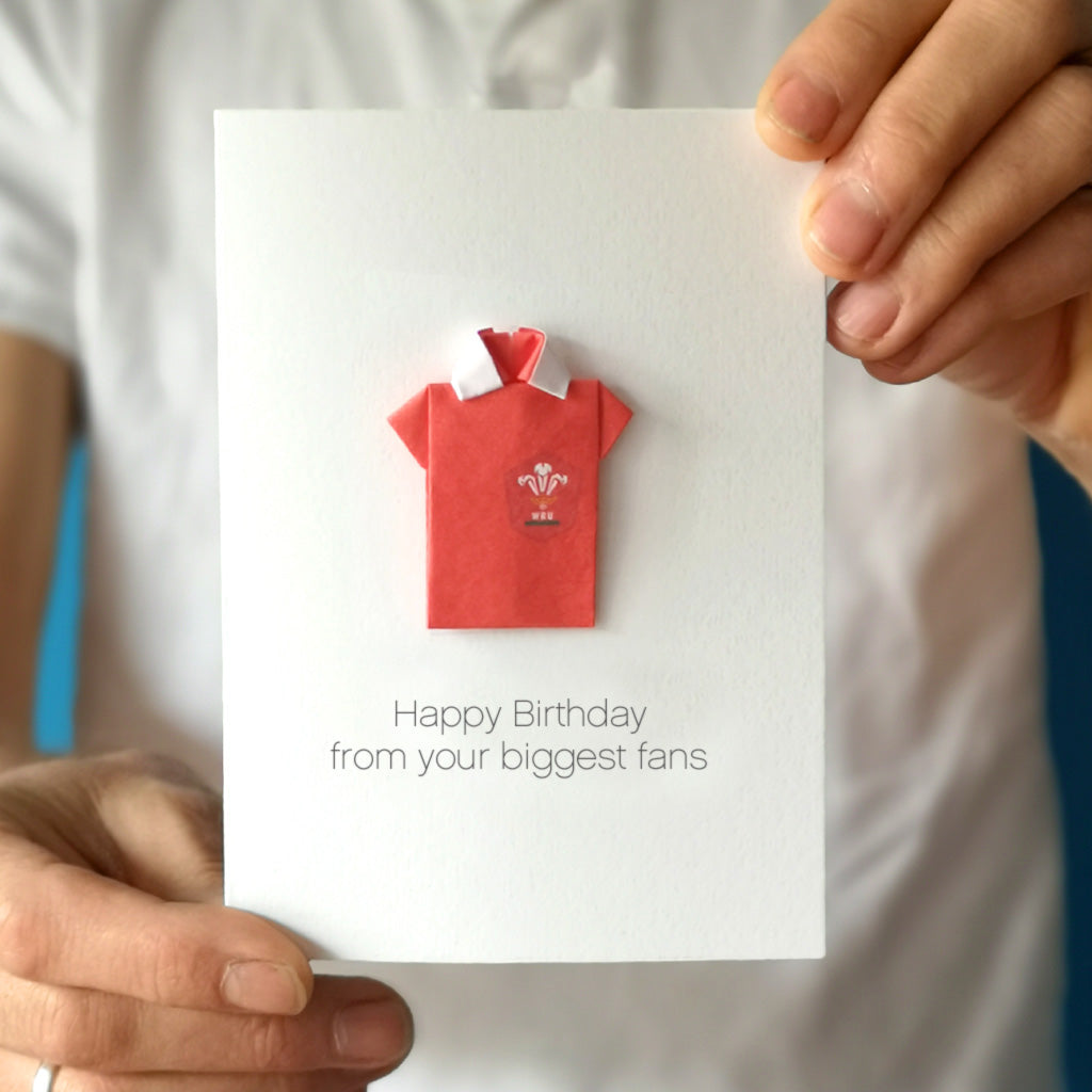 This card has a beautifully hand-folded origami rugby shirt on a 250 gsm square blue or white card encased in a white envelope. It has been left blank inside for your own message. However, if you would like it posted directly to the rugby fan, you can supply a message for the inside of the card which will be printed for you.