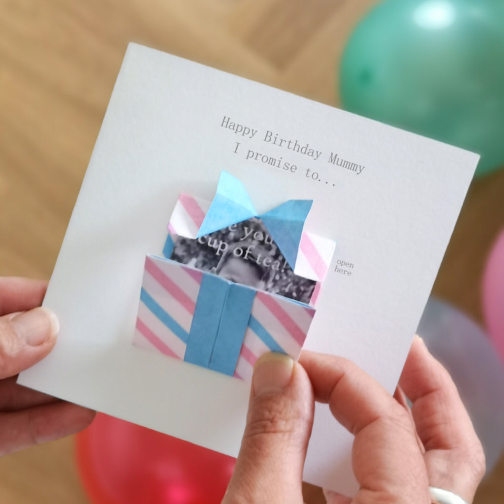 Why not brighten Mum’s birthday by sending her one of our personalised birthday origami photo cards with a hidden surprise?