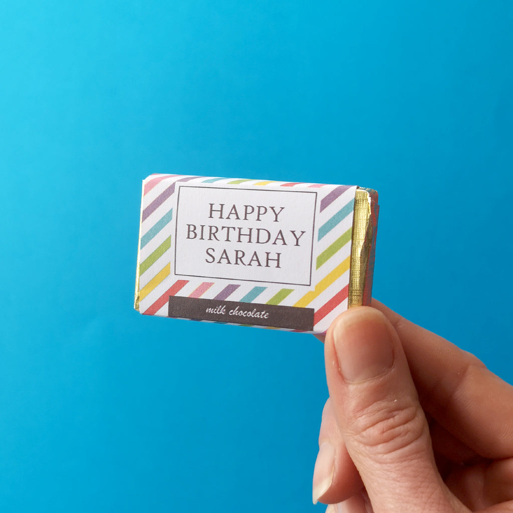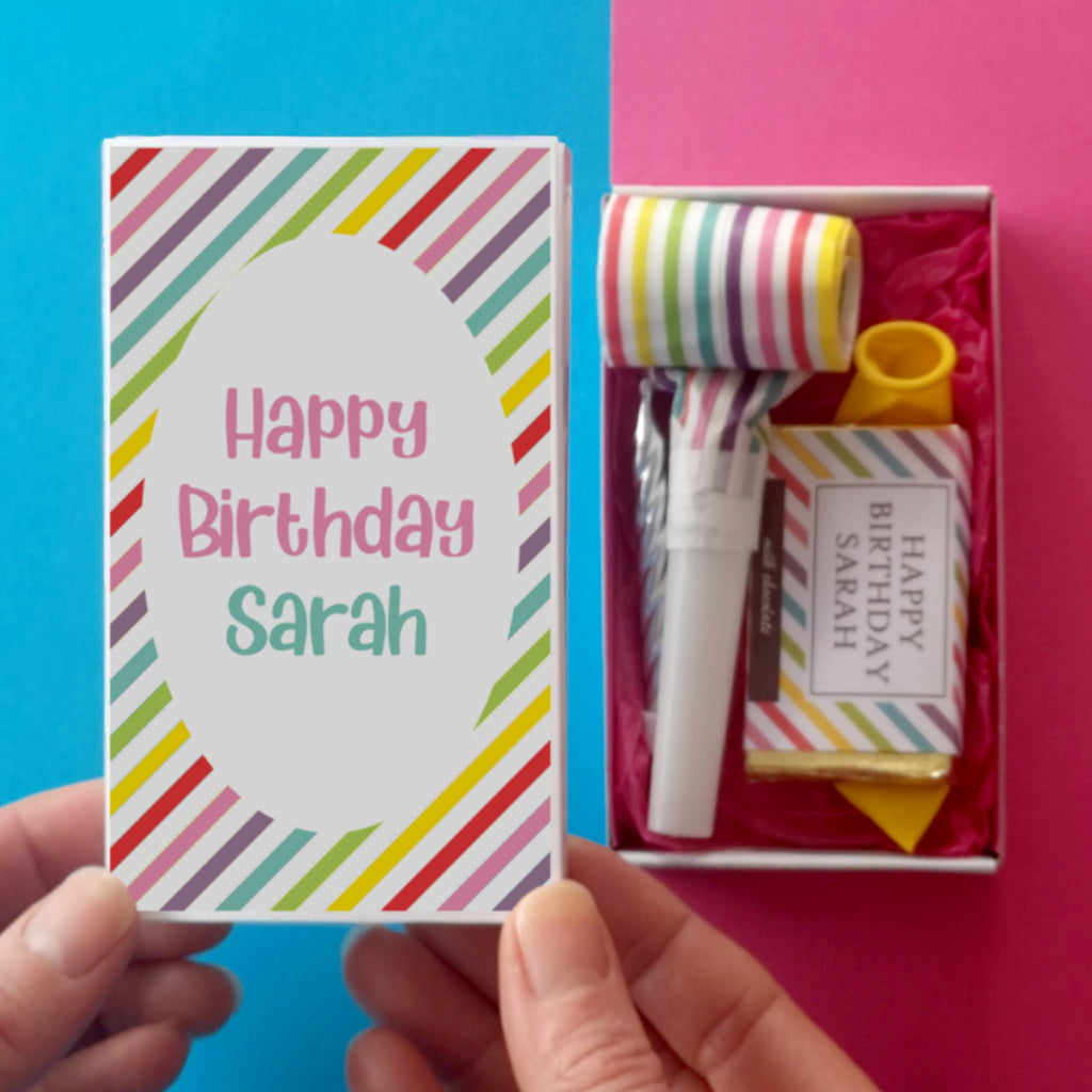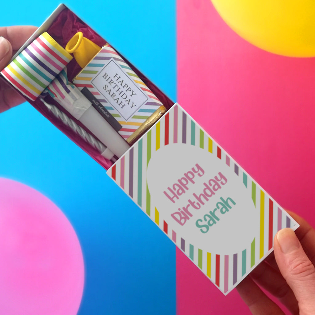 This teeny token contains a delicious personalised milk chocolate bar, a striped party blower, a silver birthday candle and a birthday balloon (colour might vary) .