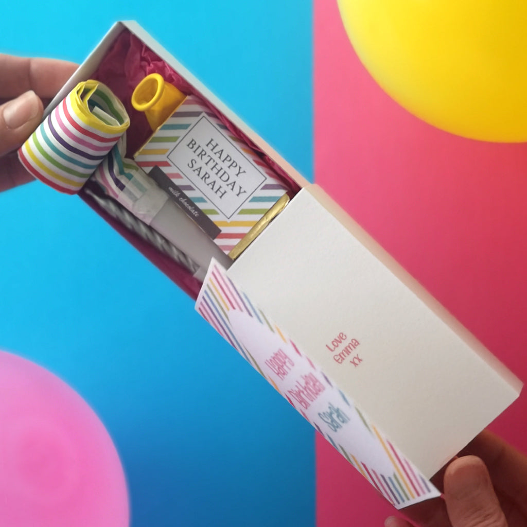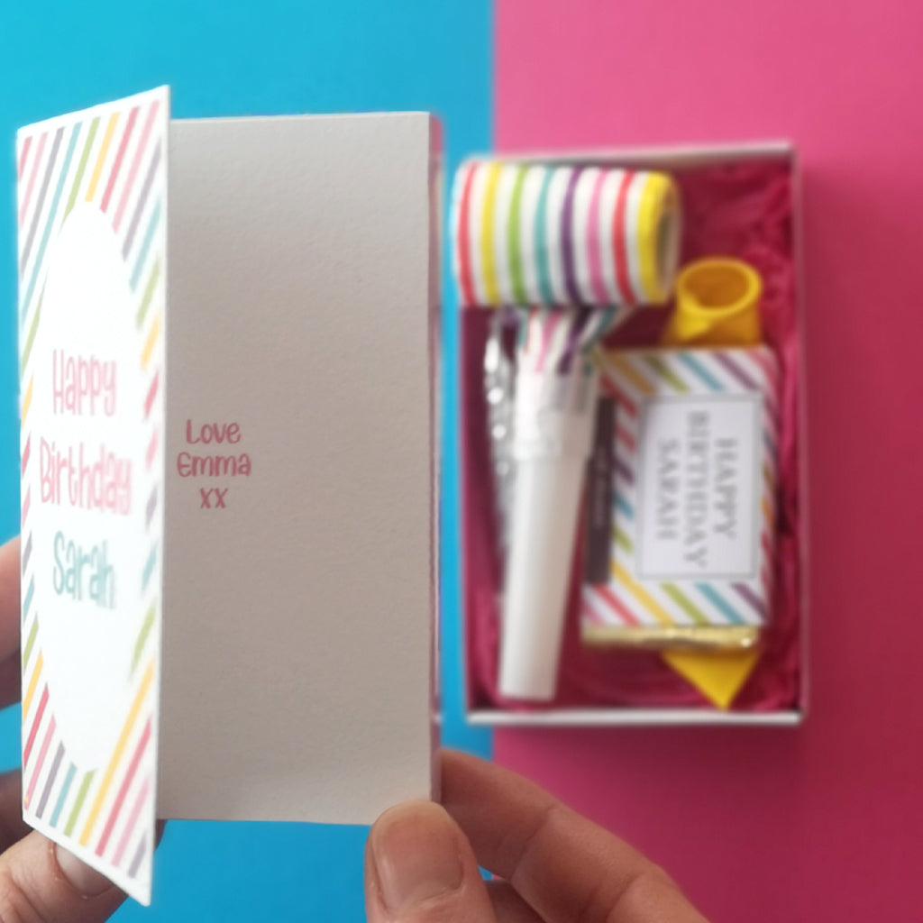 The birthday girl has everything she needs to celebrate her birthday in one box complete with a personalised card just for her. The card is attached to the box but can be opened to reveal your personalised message or you can handwrite your message yourself. The novelty party additions are revealed when the box is slid open. The card can stand alone on a shelf while the contents of the box can be used to celebrate the birthday. This teeny token is supplied with a white envelope.