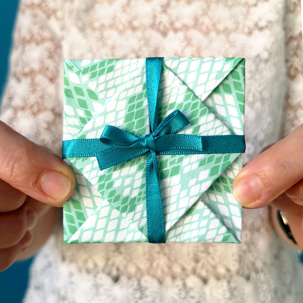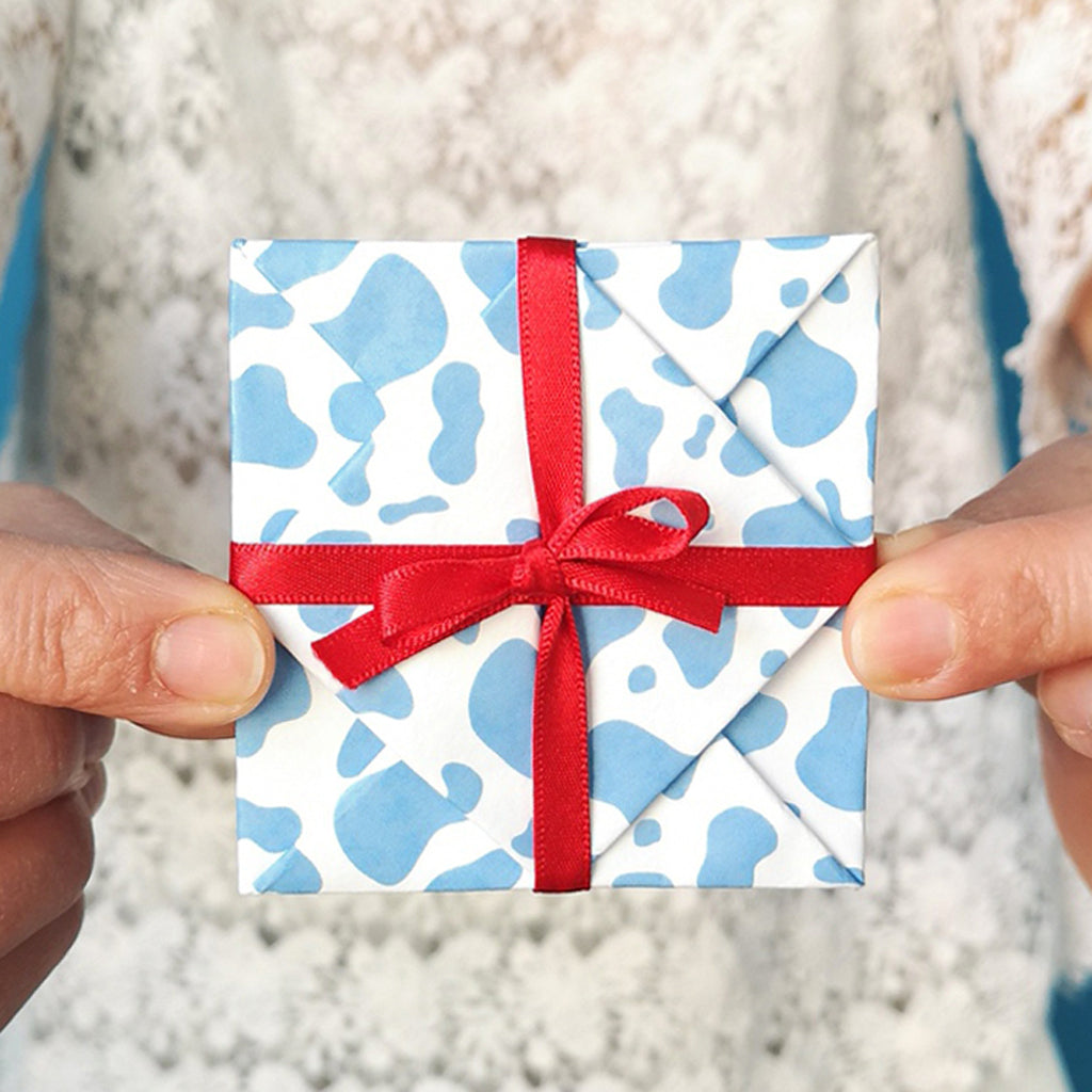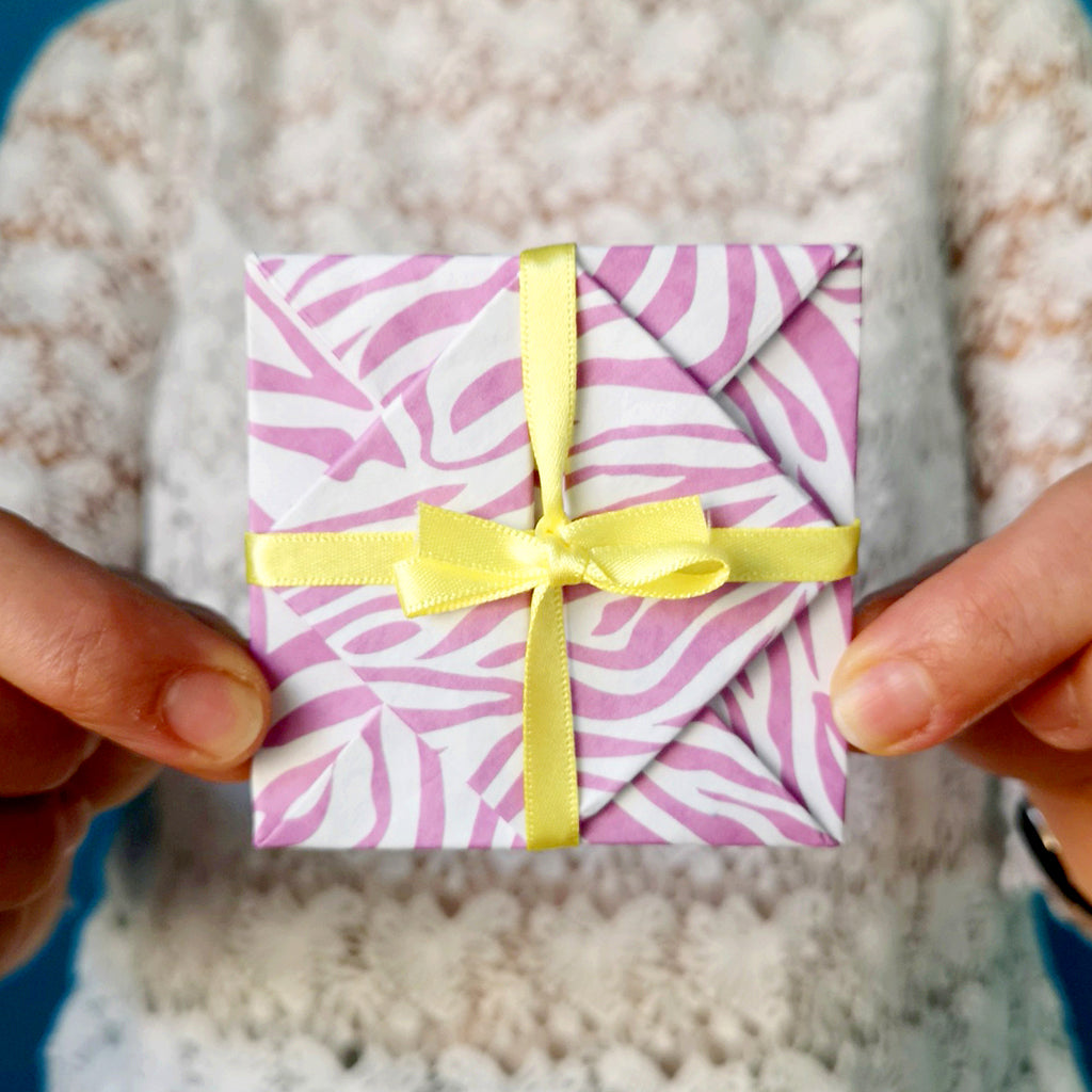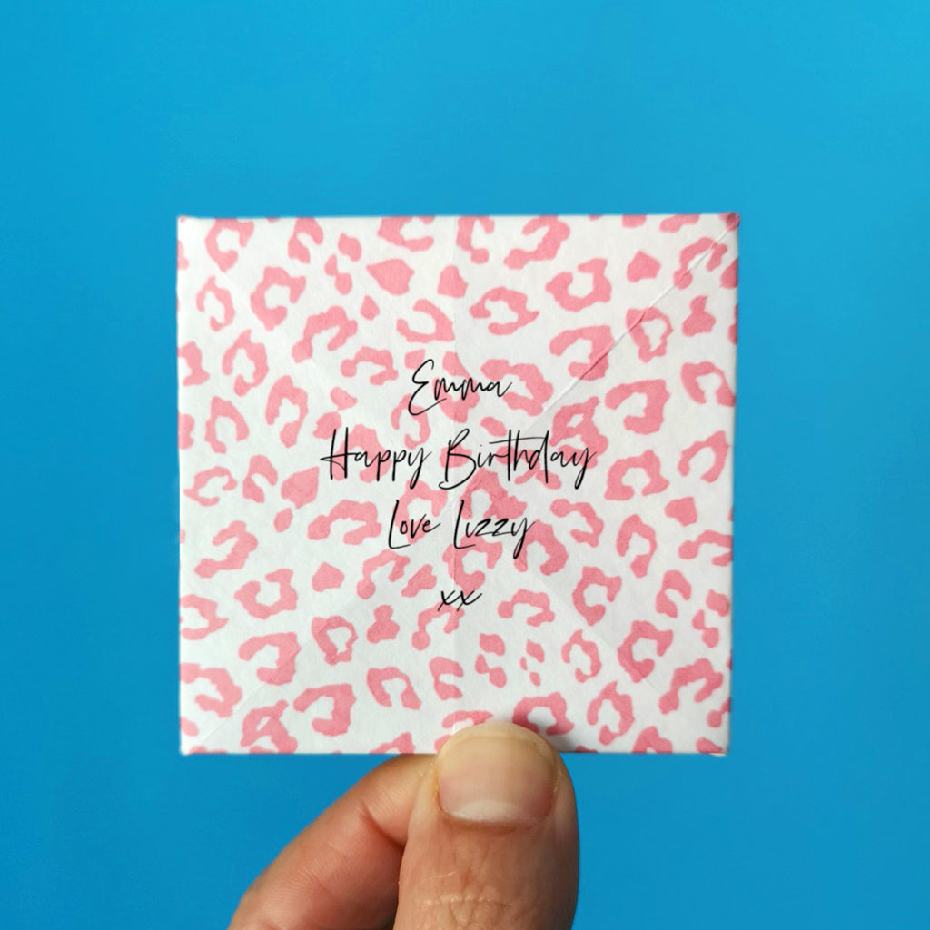 This origami birthday keepsake is handmade from 120gsm paper with a choice of animal print. It is wrapped with the colour ribbon of your choice and encased in a translucent vellum square envelope. Open the card to reveal an image of your choice printed on a photographic paper insert.