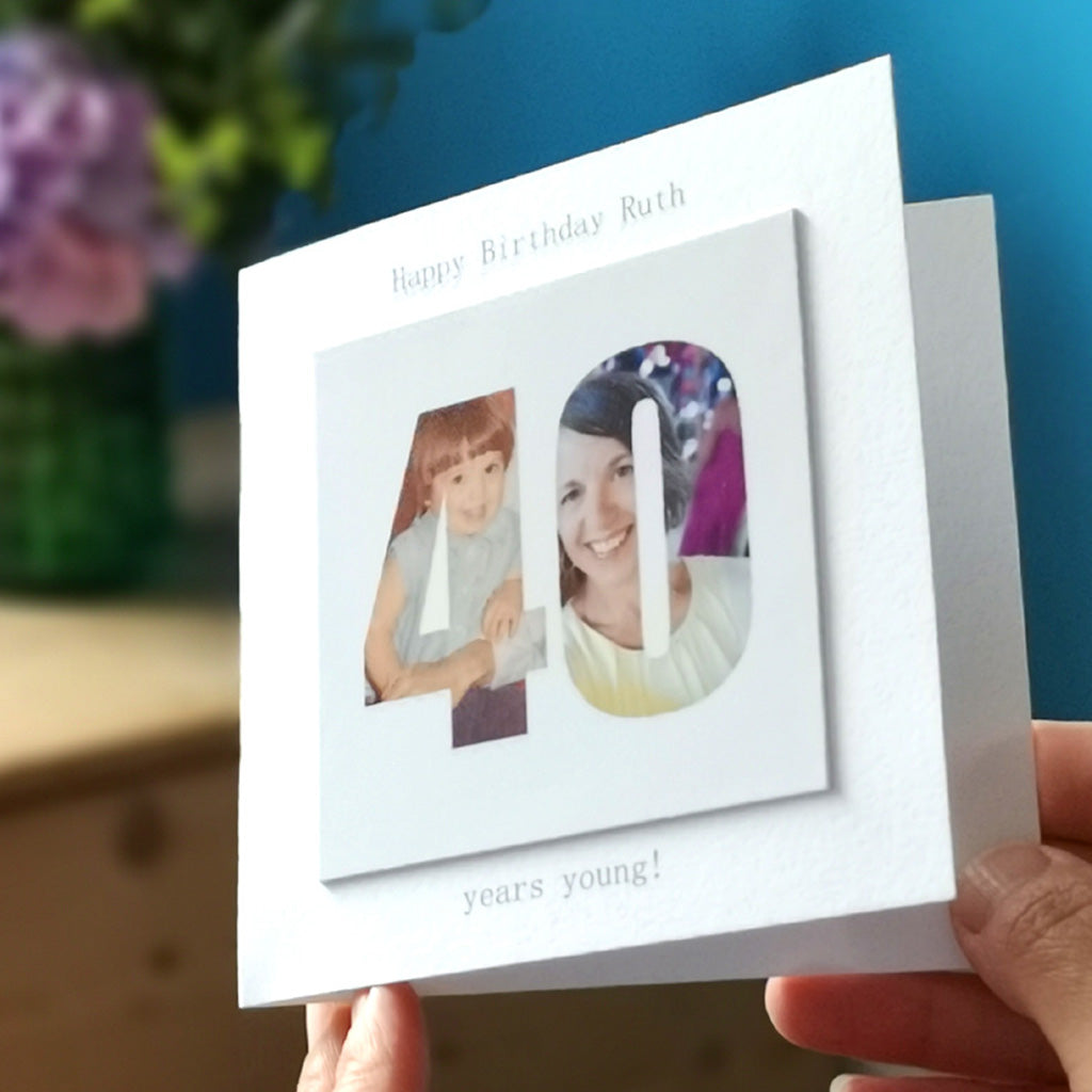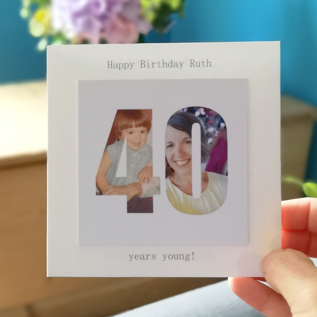Treat the birthday girl or boy to a birthday card they’ll treasure with a personalised 40th photo card using photos to spell out their age.