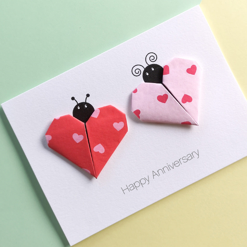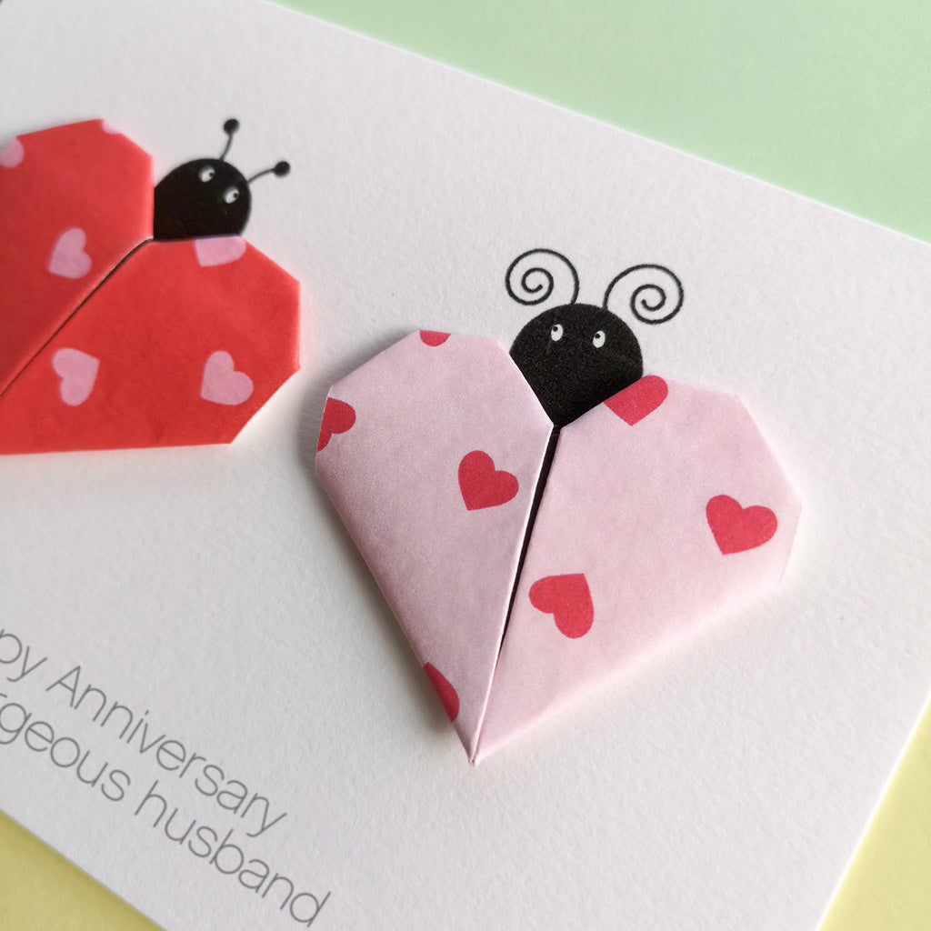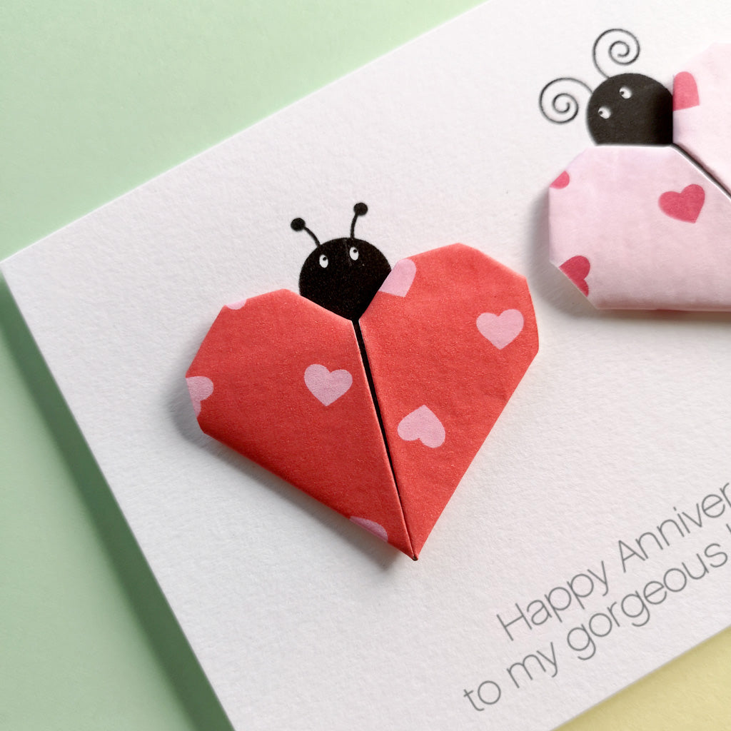 This card has two beautifully hand-folded origami heart love bugs. One origami heart bug is red with pink hearts and the other origami heart bug is pink with red hearts. Both bugs have antennae which are printed on 250 gsm hammered white card. This anniversary card is encased in a crisp white envelope.