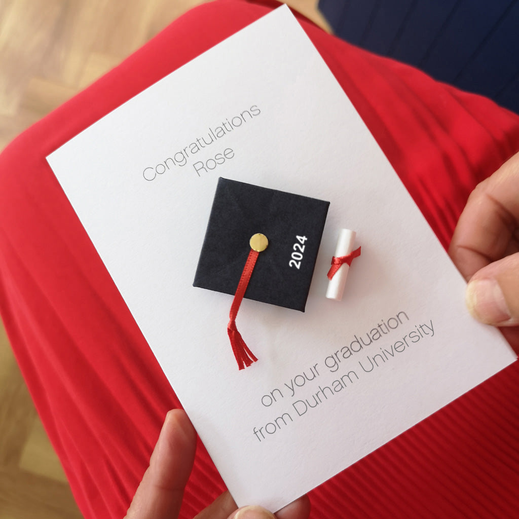 This card can be personalised with the graduate's name and name of the University or institution they graduated from.