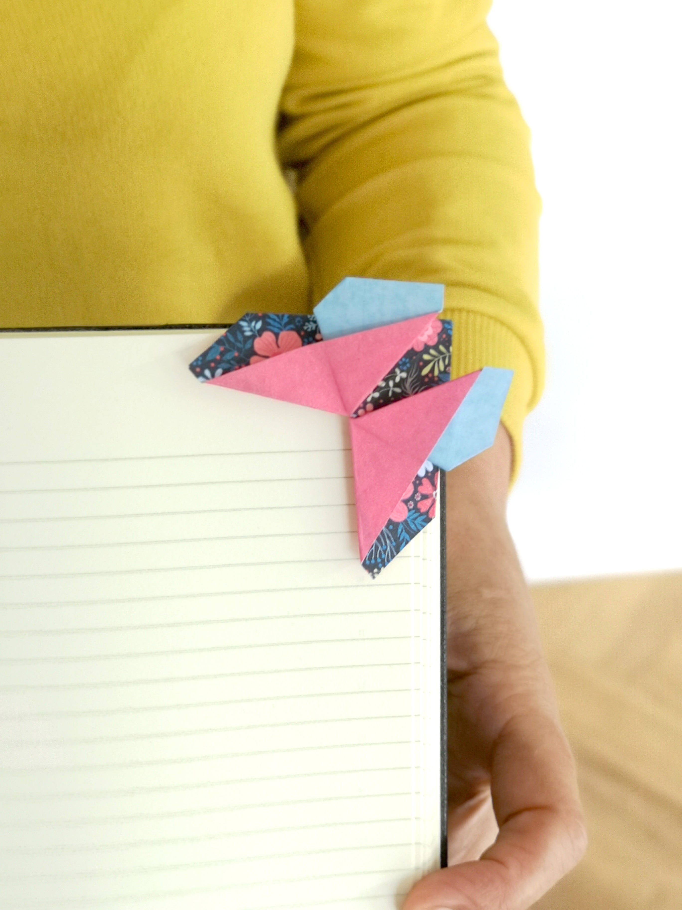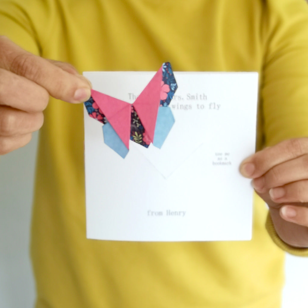 This card features a handmade origami butterfly bookmark which can be detached from the card and used by the teacher as a useful and lasting memento.