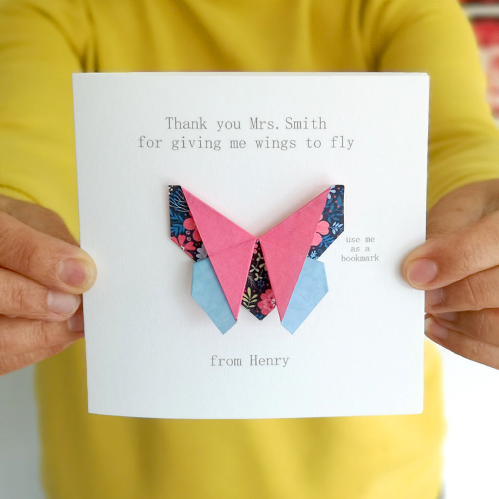 Give the teacher a thank you card with a difference. This personalised teacher thank you card comes with a detachable butterfly bookmark.