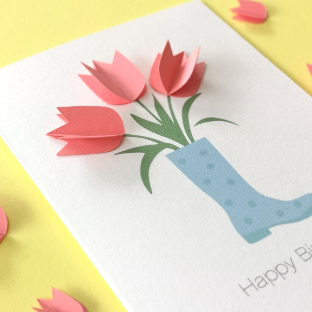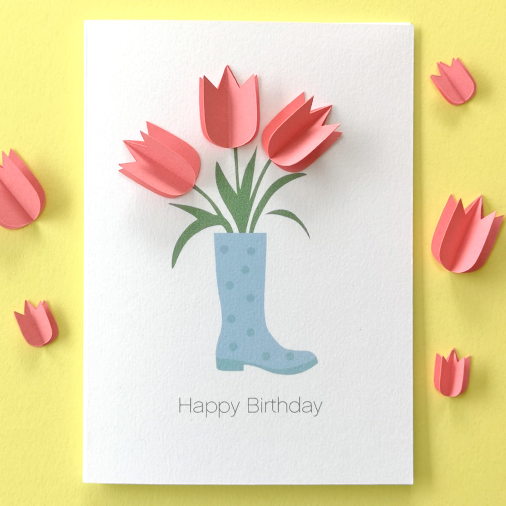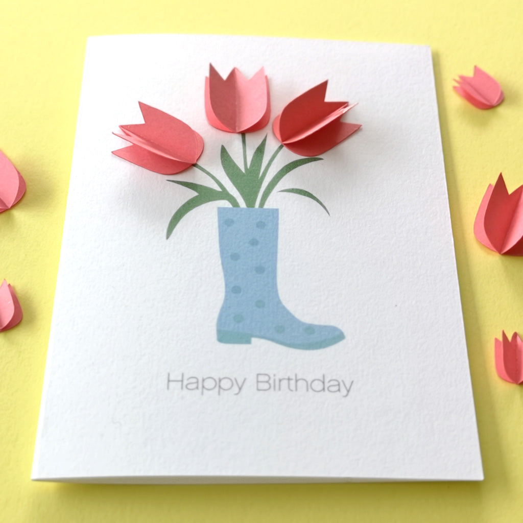 A delightful way to celebrate a birthday with a touch of gardening charm! This card has beautifully cut and folded red tulips. The wellie illustration is printed on 250gsm hammered white card. This birthday card is encased in a crisp white envelope.