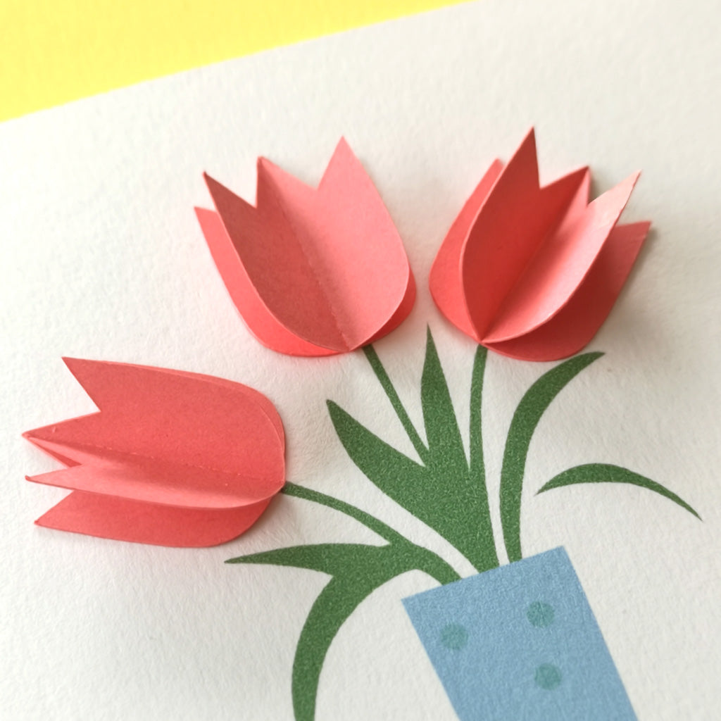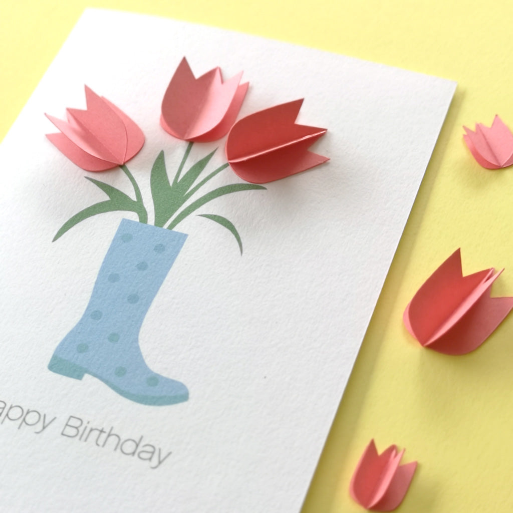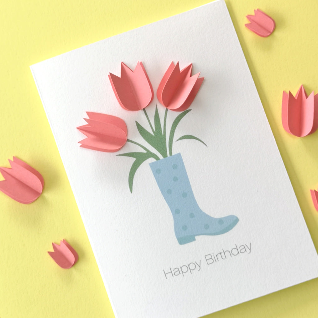 A delightful way to celebrate a birthday with a touch of gardening charm! This card has beautifully cut and folded red tulips. The wellie illustration is printed on 250gsm hammered white card. This birthday card is encased in a crisp white envelope.