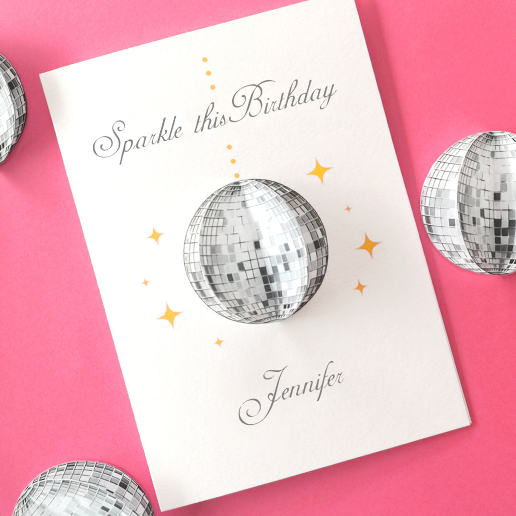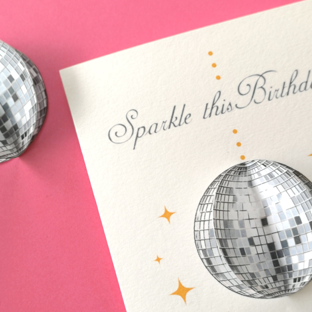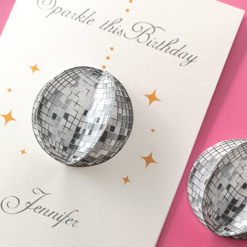 Inspired by the glamour of the ballroom, the card features a striking 3D paper illustrated mirror ball, surrounded by illustrated yellow stars, for a dazzling disco feel.