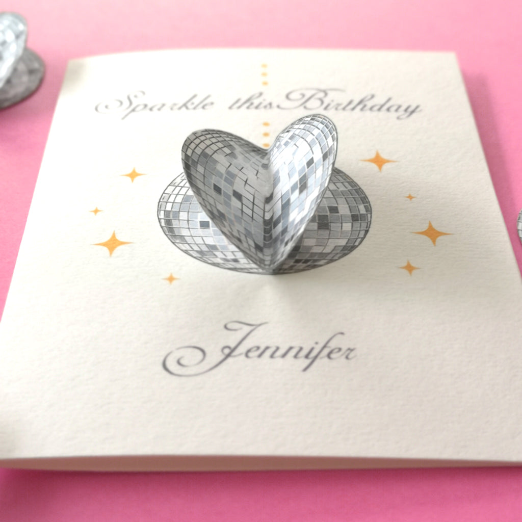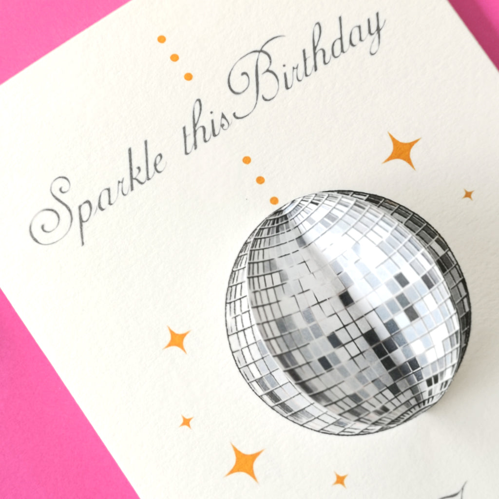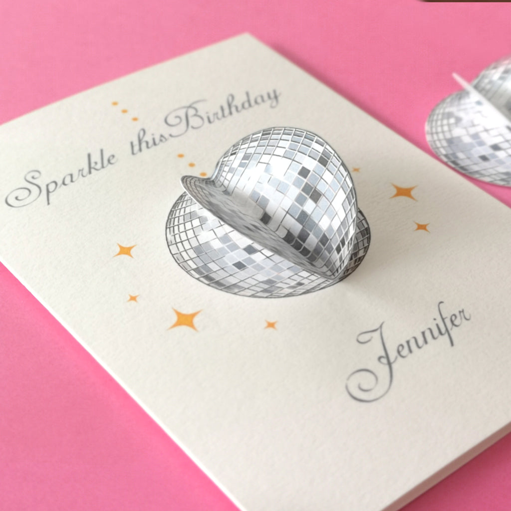 Inspired by the glamour of the ballroom, the card features a striking 3D paper illustrated mirror ball, surrounded by illustrated yellow stars, for a dazzling disco feel.
