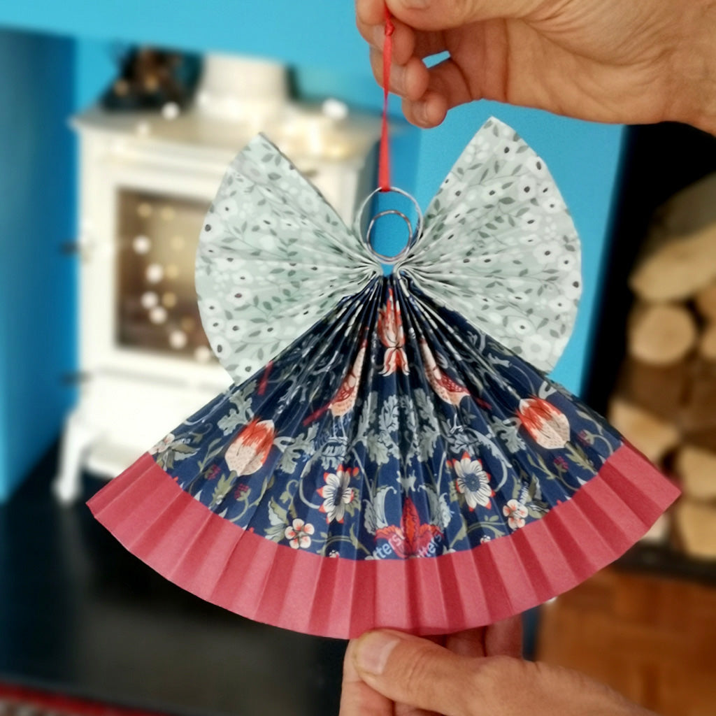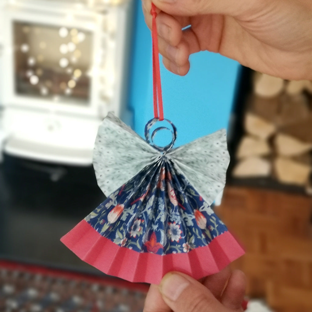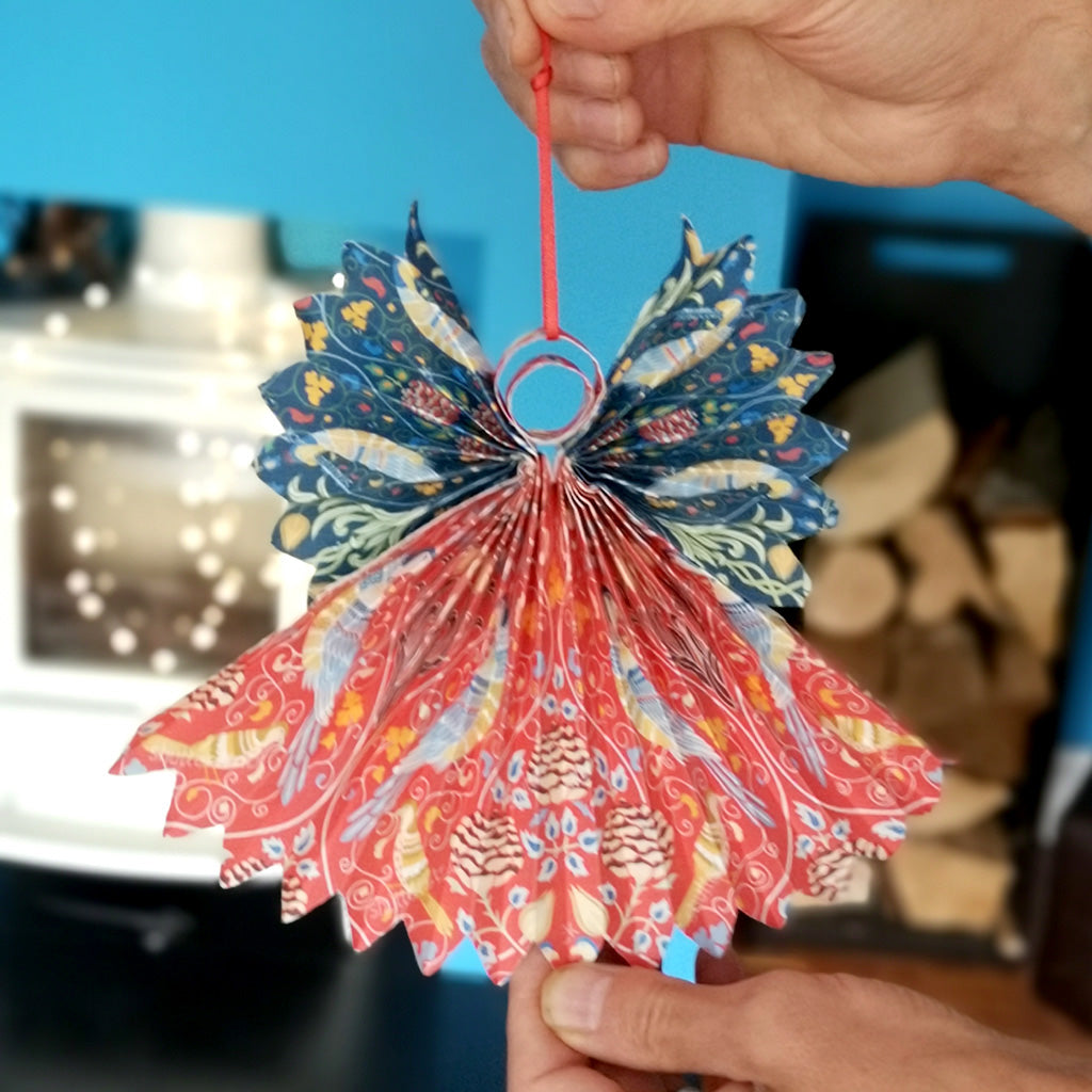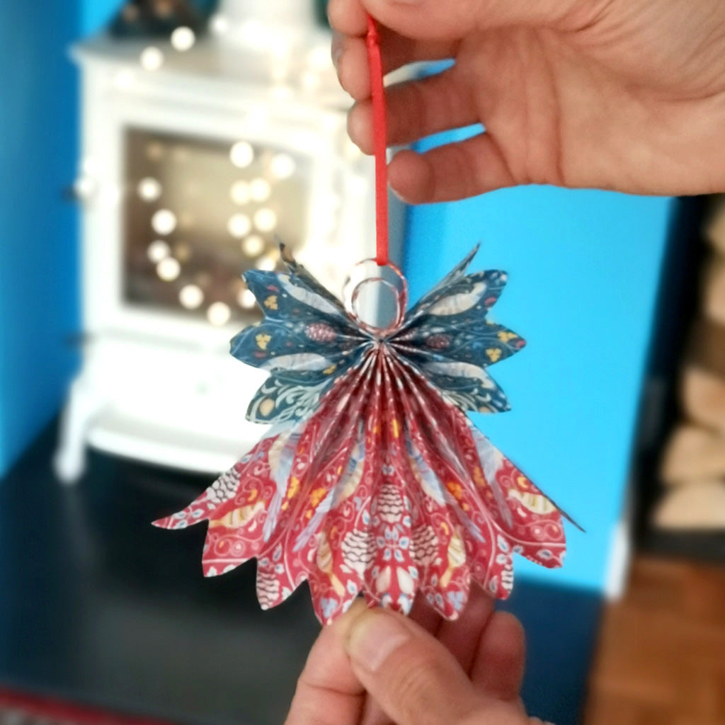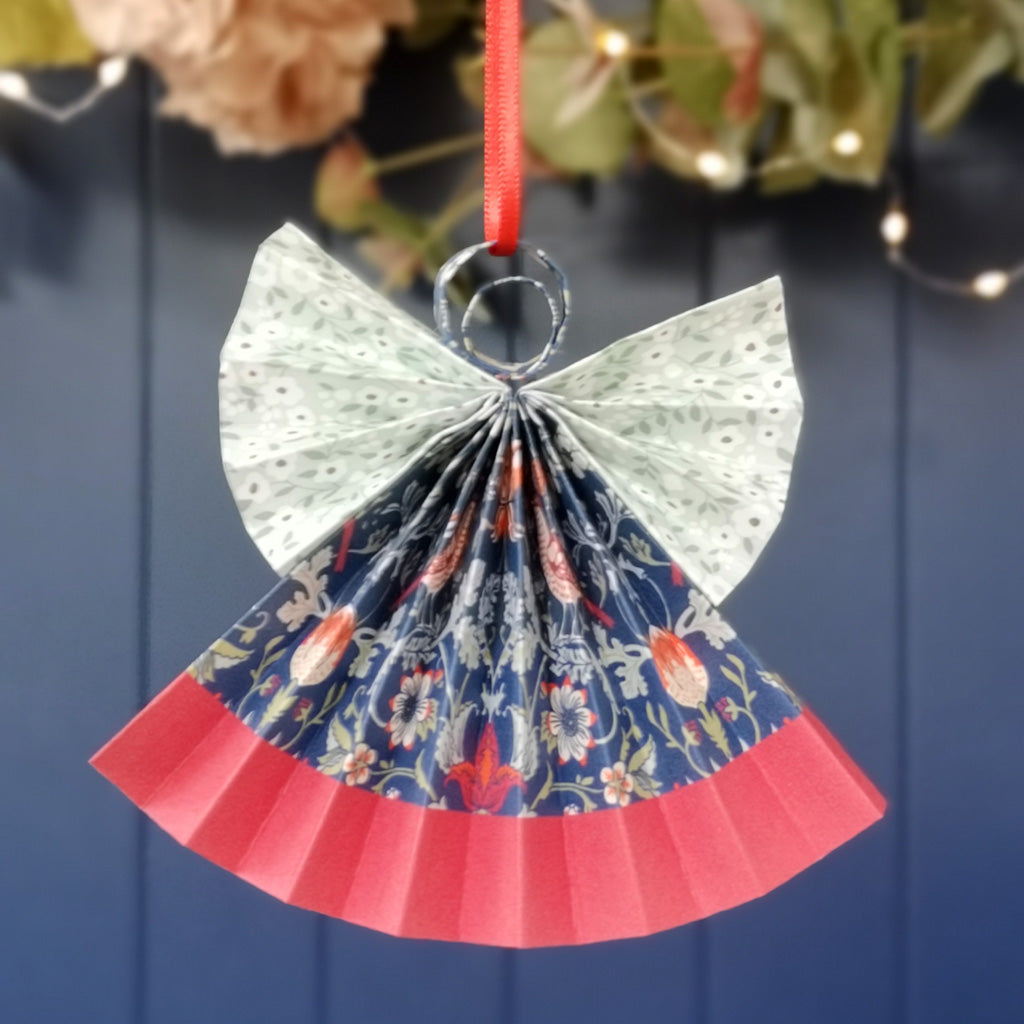 This handmade paper angel Christmas Tree Decoration is hand folded from 250gsm pattern paper. The pattern is on two sides and the angel comes with a red ribbon for hanging in your home or on your Christmas tree.