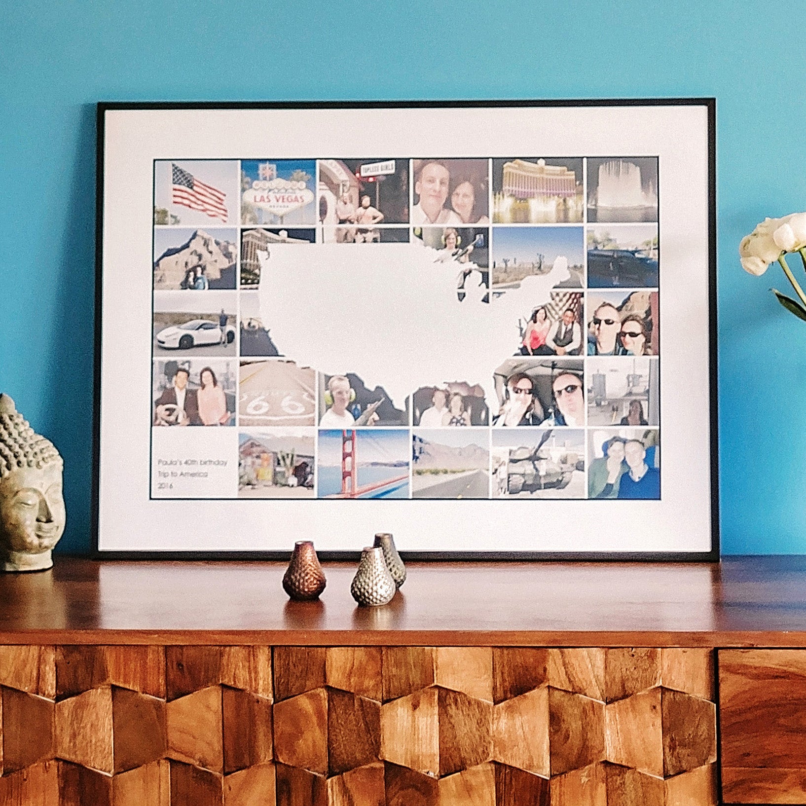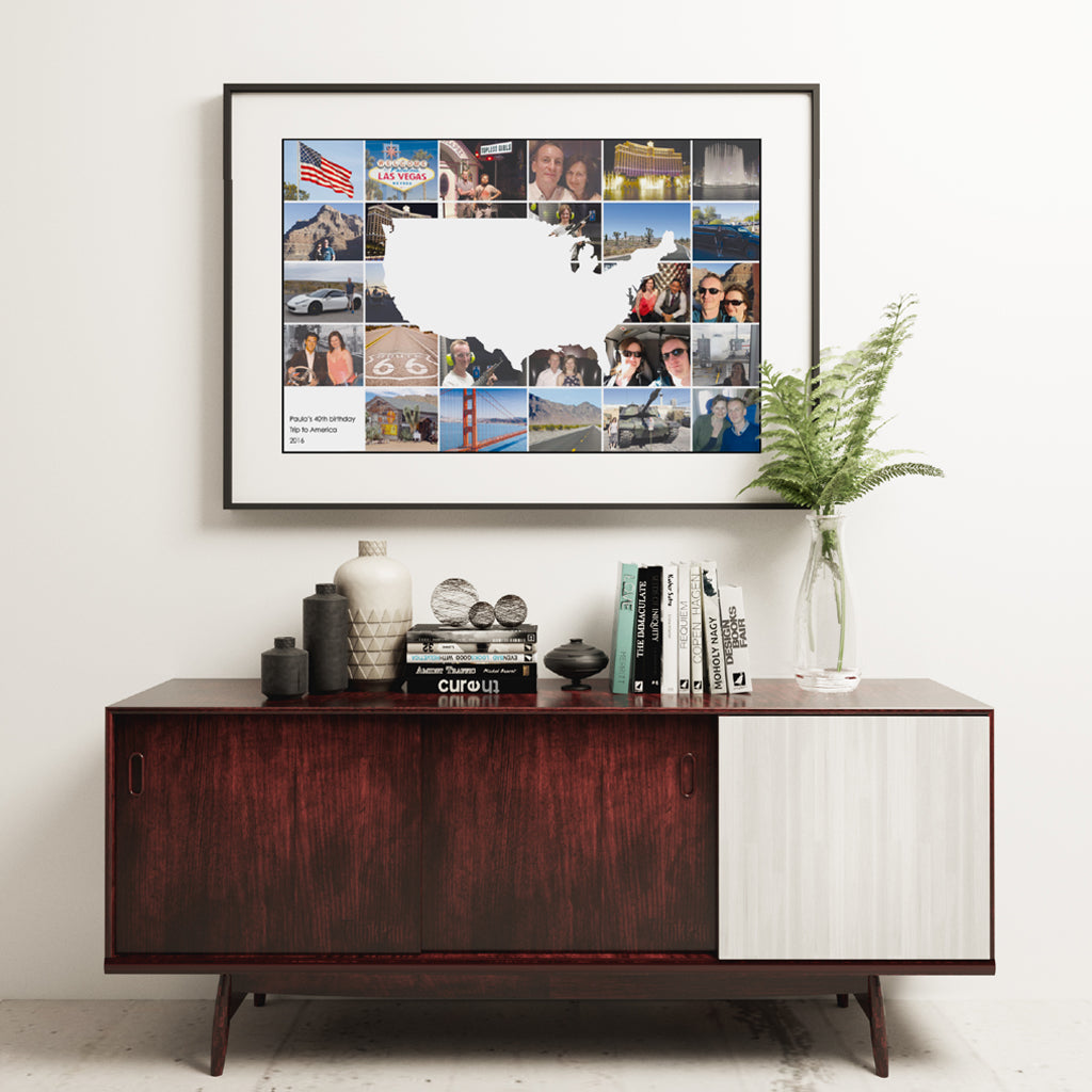 Want to display your travel photos in a stylish way? Create a personalised travel photo collage map with the country of your choice.