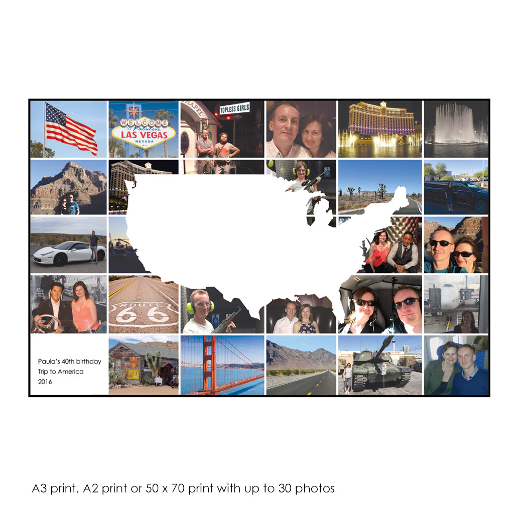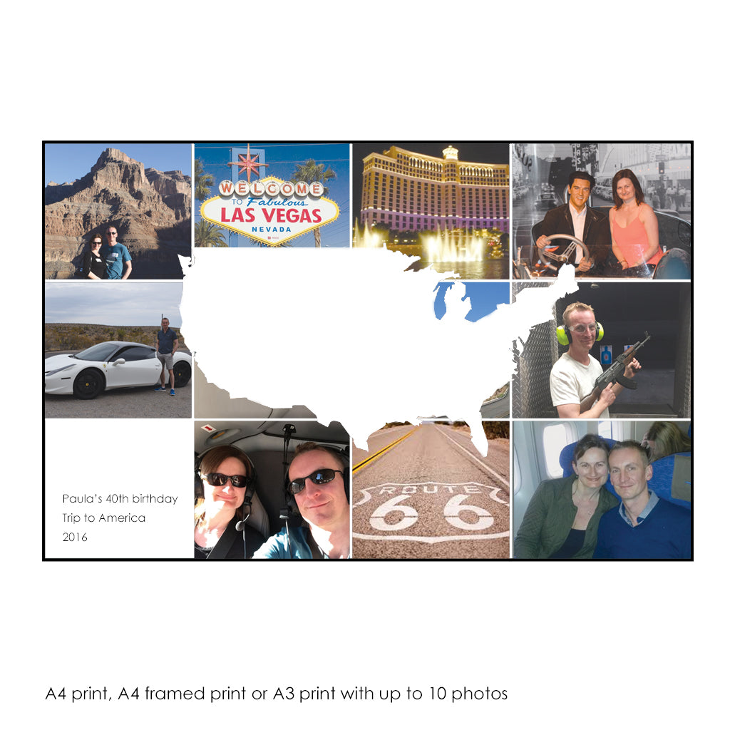 You can also have a caption in the bottom left square of your print eg. 'Paula's 40th birthday Trip to America 2016'. Or you can choose to have a photograph here instead of a caption and send an extra photo.